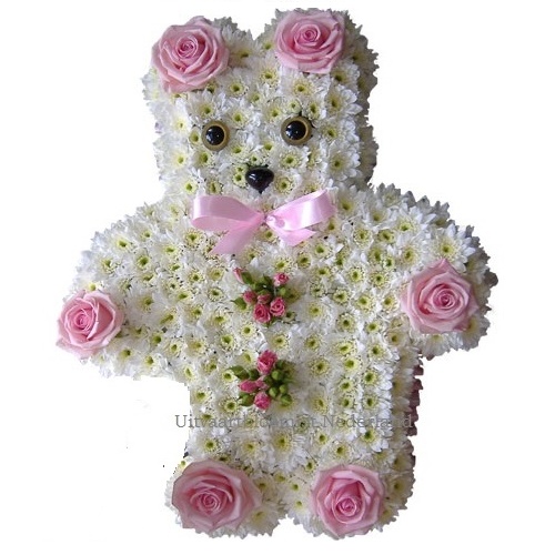 Speciaal voor kinderuitvaarten zijn deze rouwarrangementen opgemaakt in het model van een beer. Kleur wit met roze bloemen. Andere kleuren ook mogelijk Onze specialisten helpen u graag met de juiste keuze.