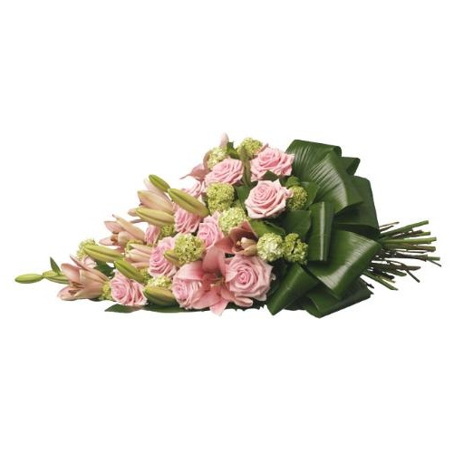 Een stijlvol rouwboeket bestaande uit diverse roze bloemen aangevuld met bladmaterialen. Dit rouwboeket zal door één van onze specialisten met zorg gemaakt worden. We streven ernaar u een zo groot mogelijk rouwboeket te leveren voor het besteedbare bedrag.