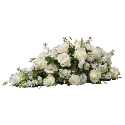Rouwstuk Leiden opgemaakt als mooi rouwstuk met diverse witte bloemen. Voor elke uitvaart maken onze specialisten een mooi rouwarrangement. Bezorging in elke plaats in Nederland.